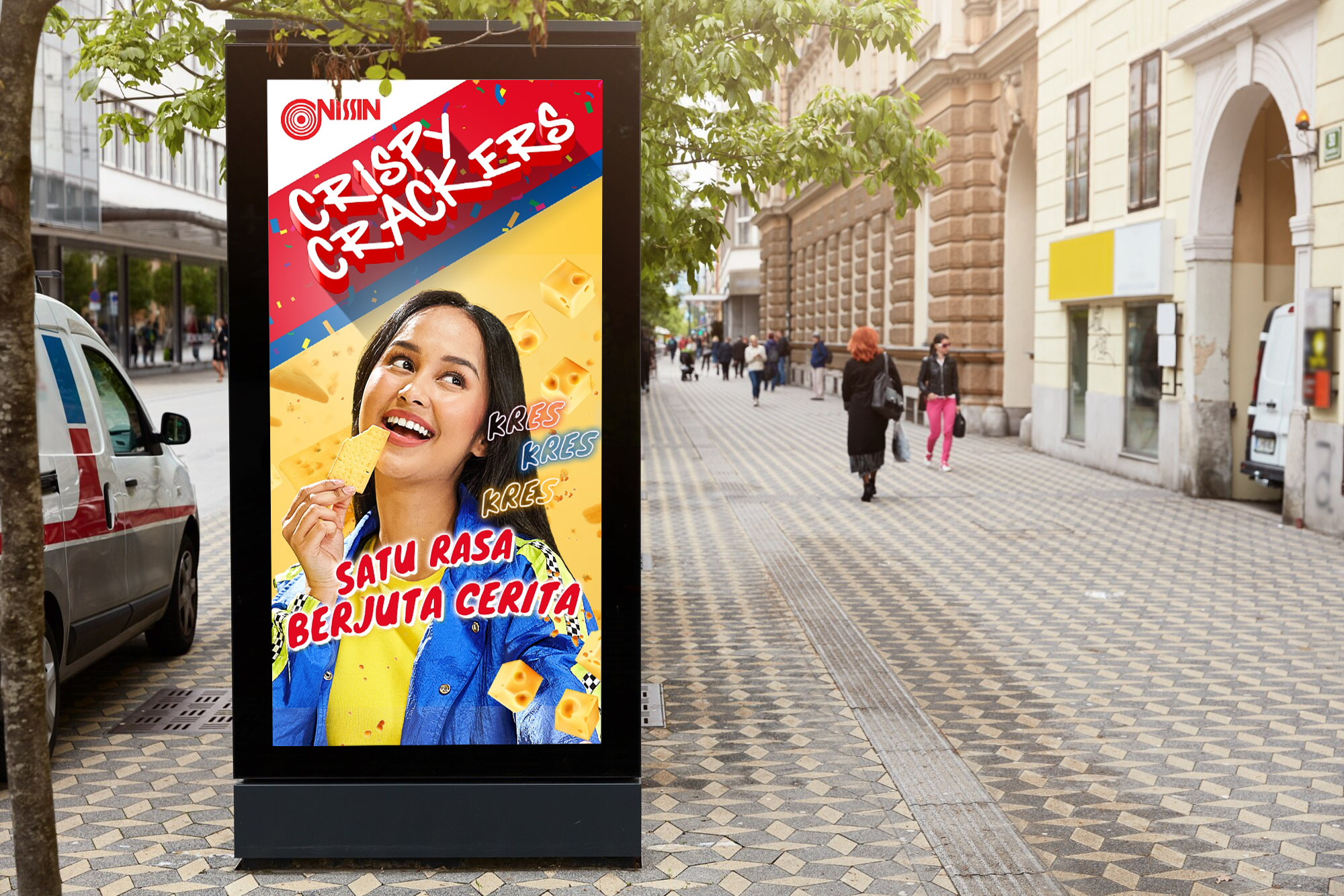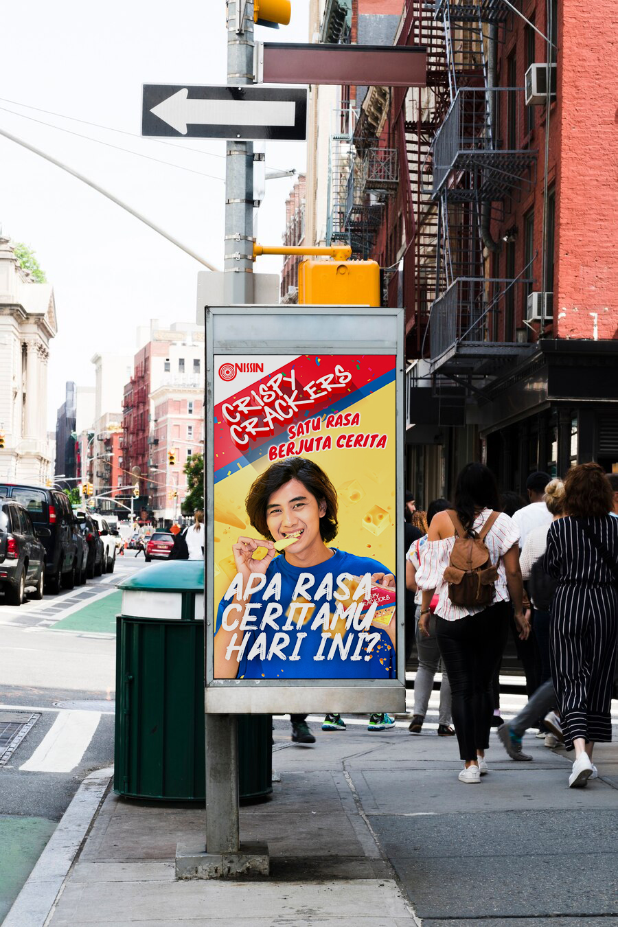 We use young boys and girls enjoying Nissin Crispy Crackers products as our main visual. A dynamic visual arrangement with vivid colours would undoubtedly make it more appealing and pertinent to its target audience, which is young people.